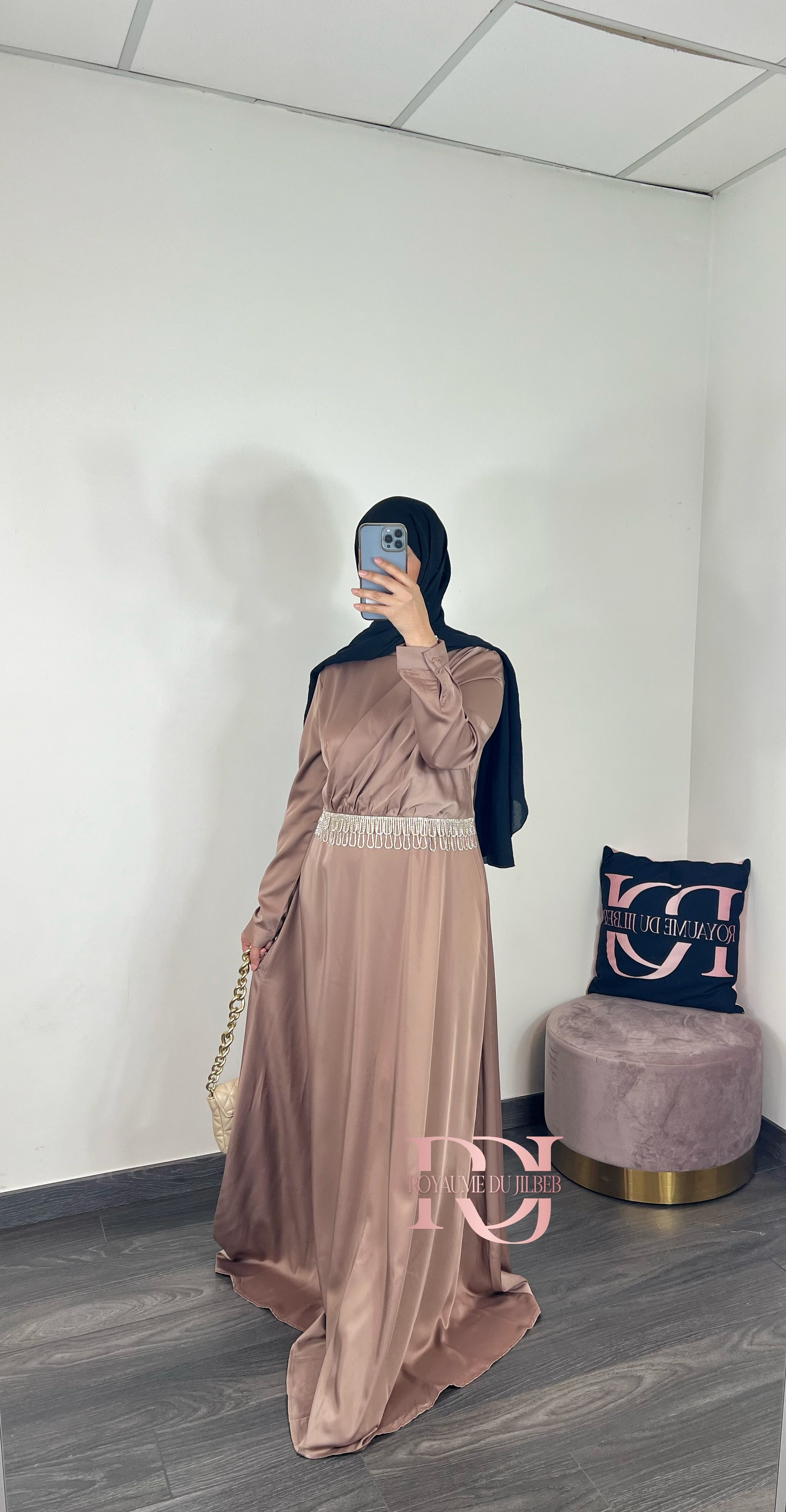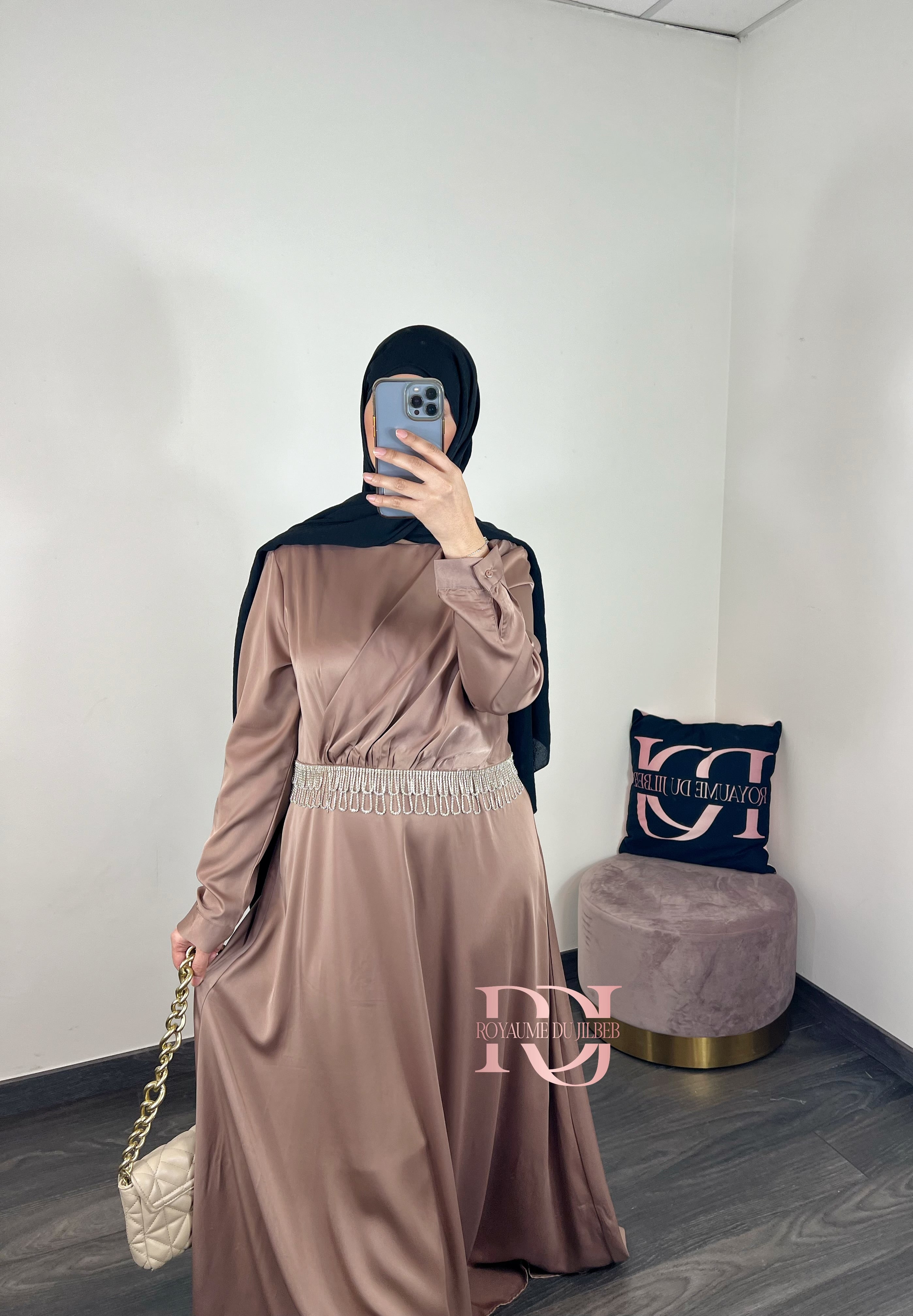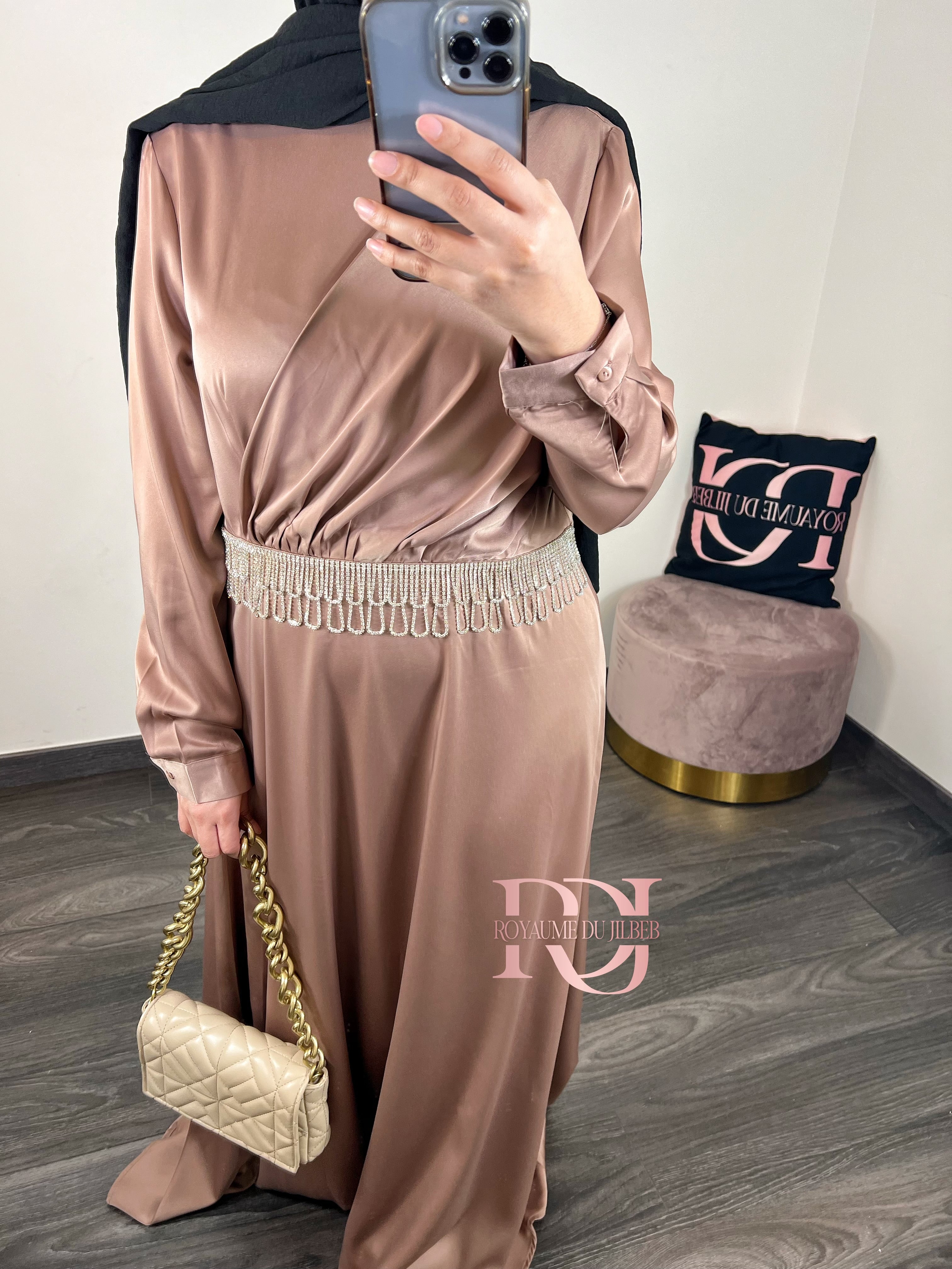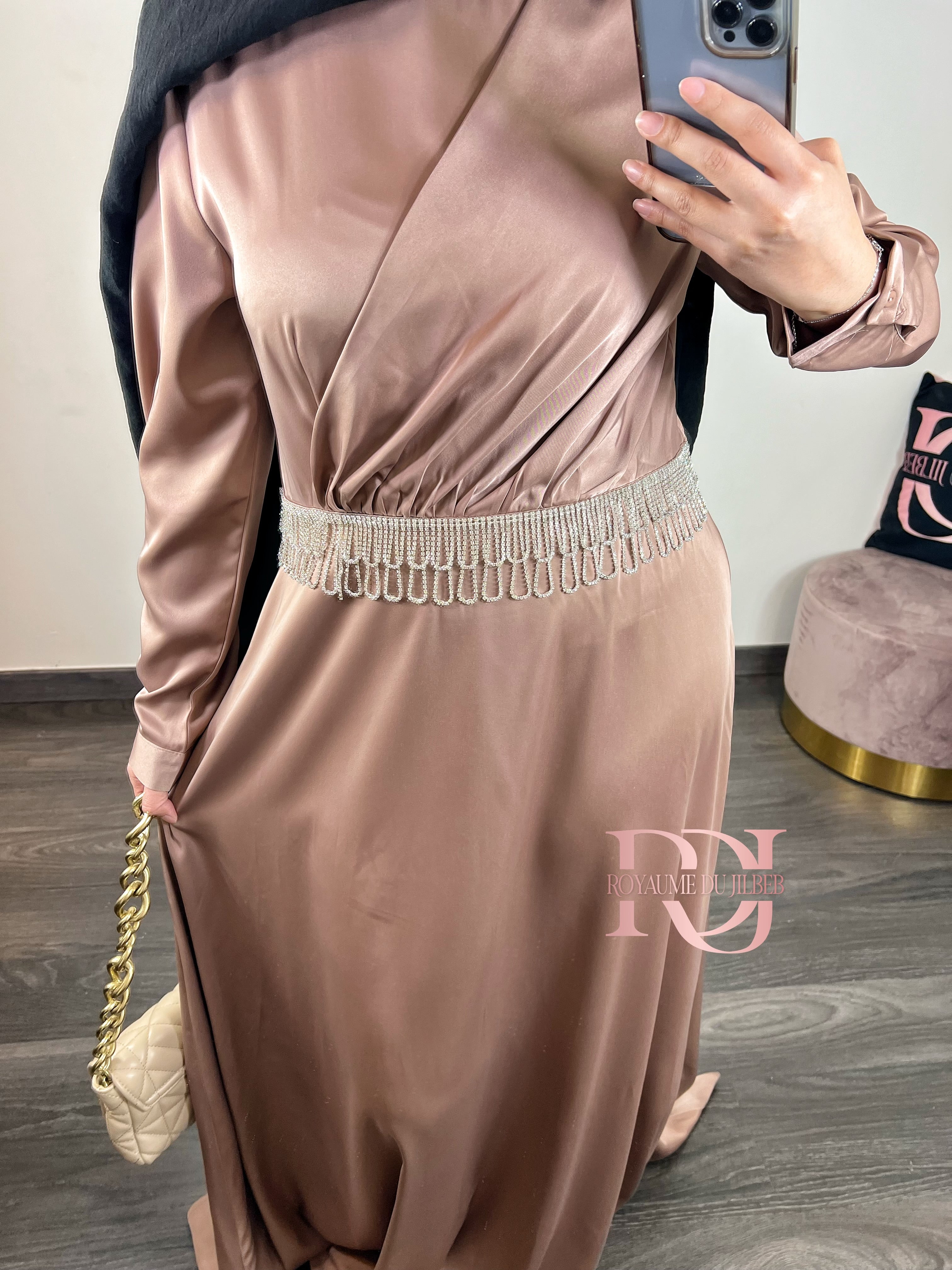 Robe Emmy en tissu nidha avec un croisement sur le haut de la robe, un perlage type diamant sous forme de ceinture integré a la robe et une ouverture zip à l’arriere au dos.