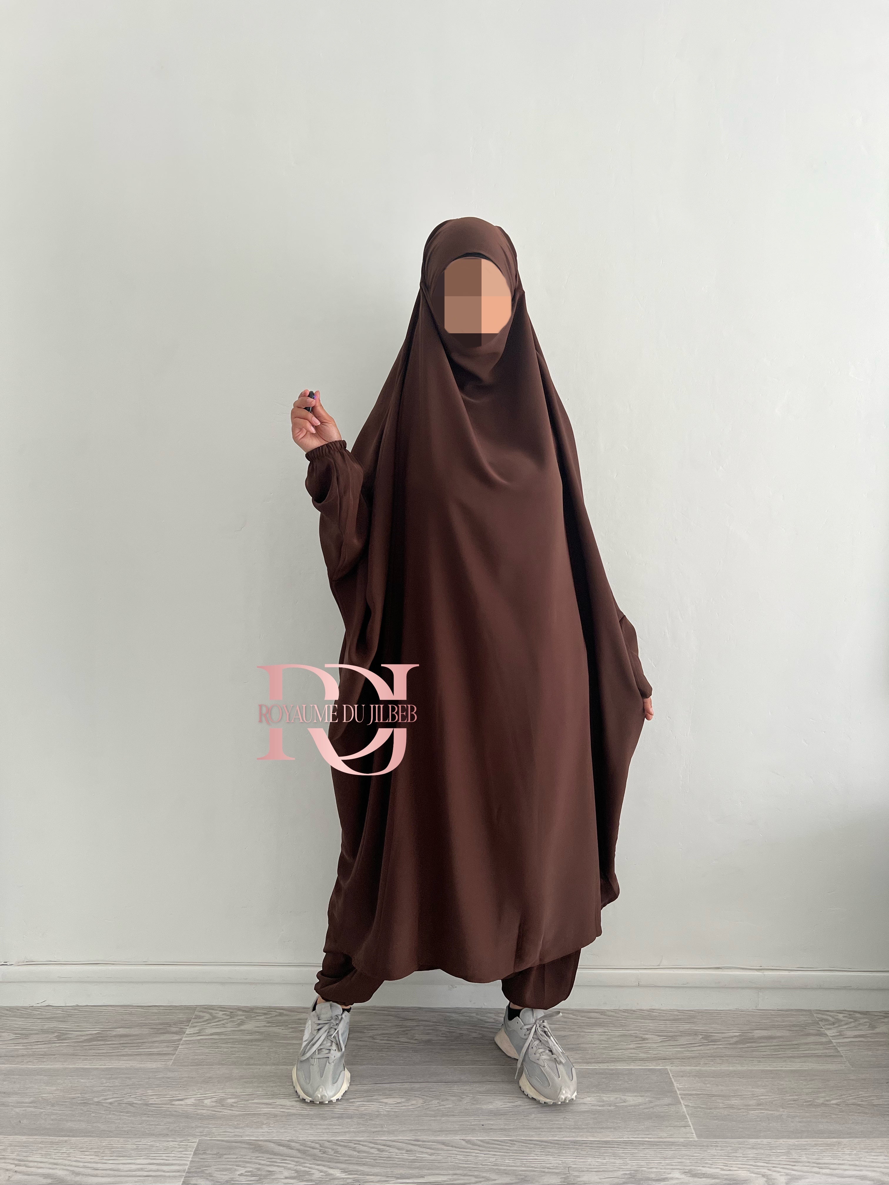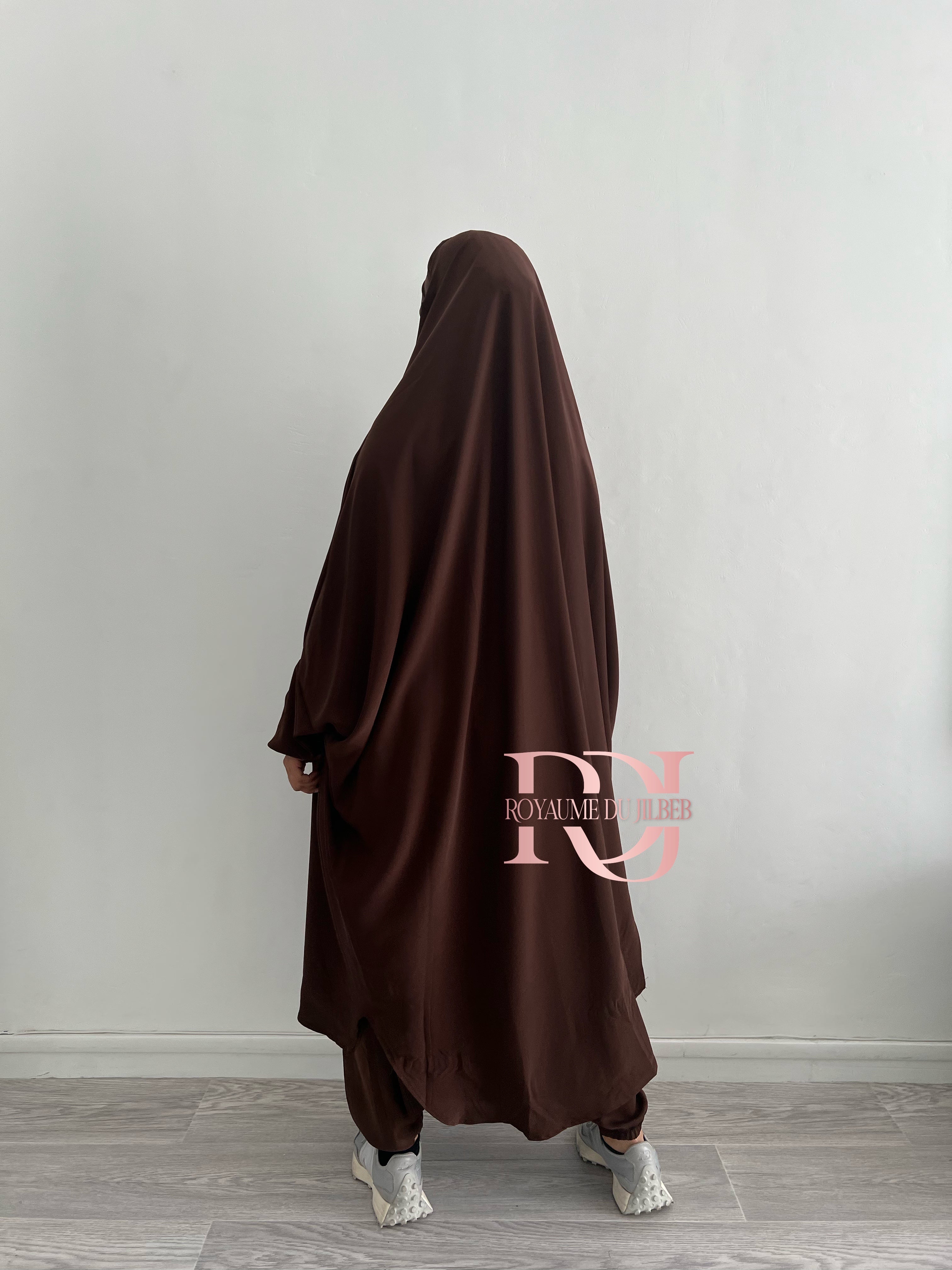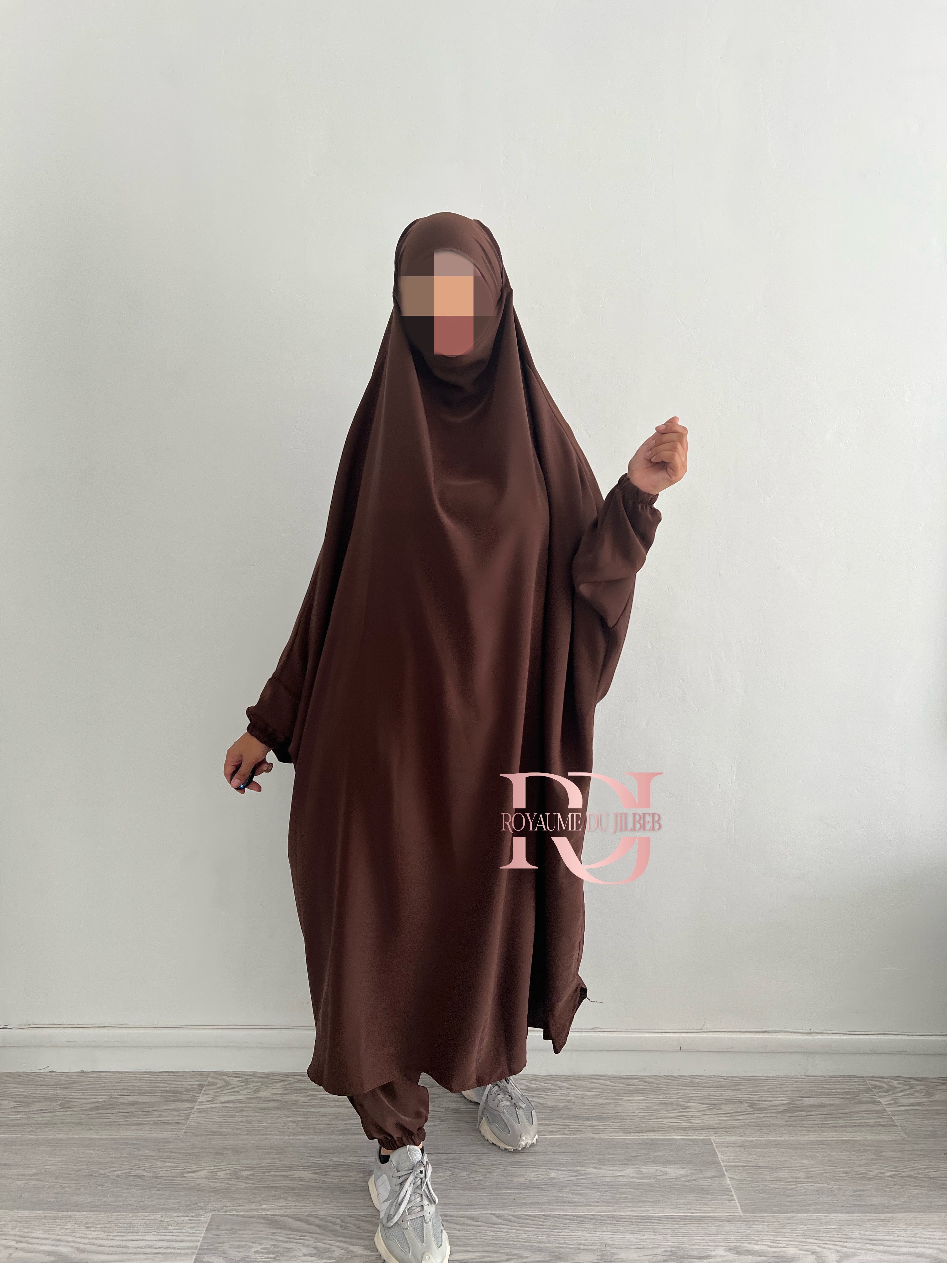 Jilbeb 2 pièces sarouel en soie de medine, couleur marron chocolat