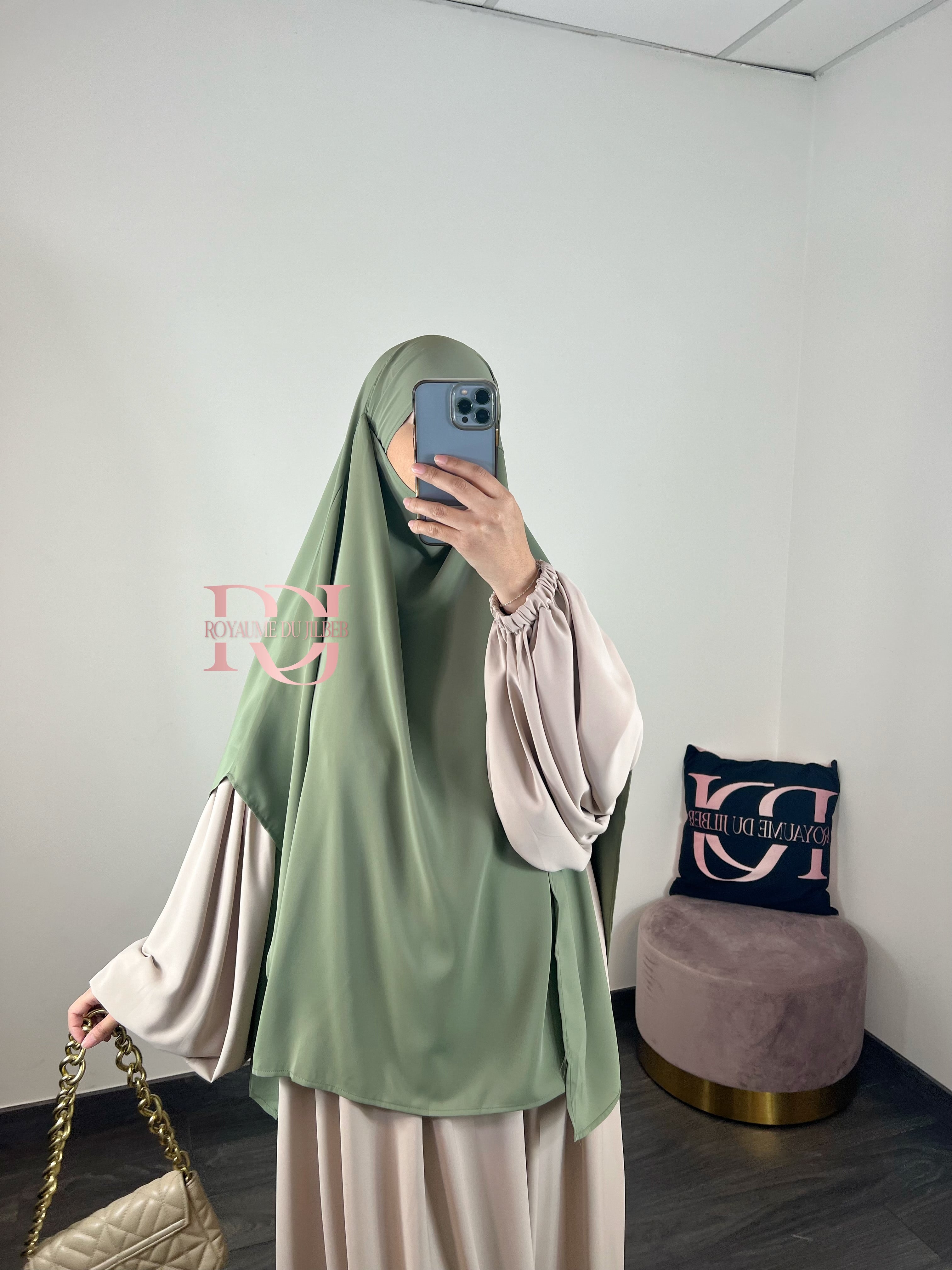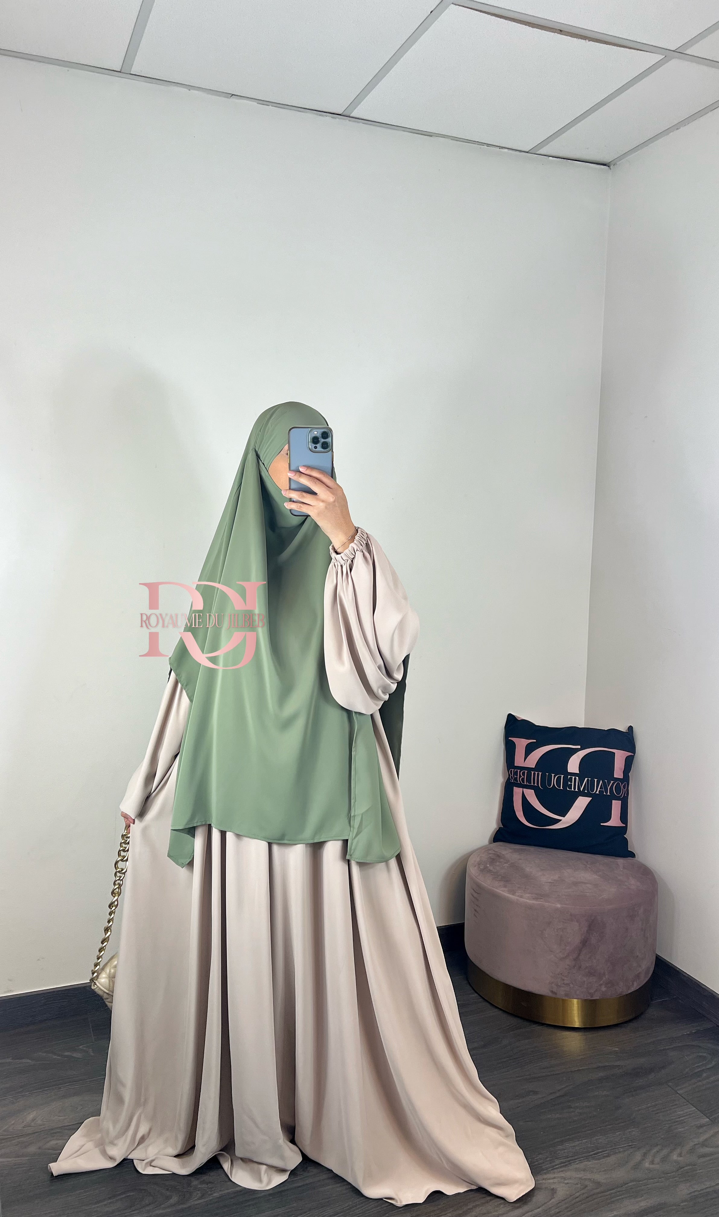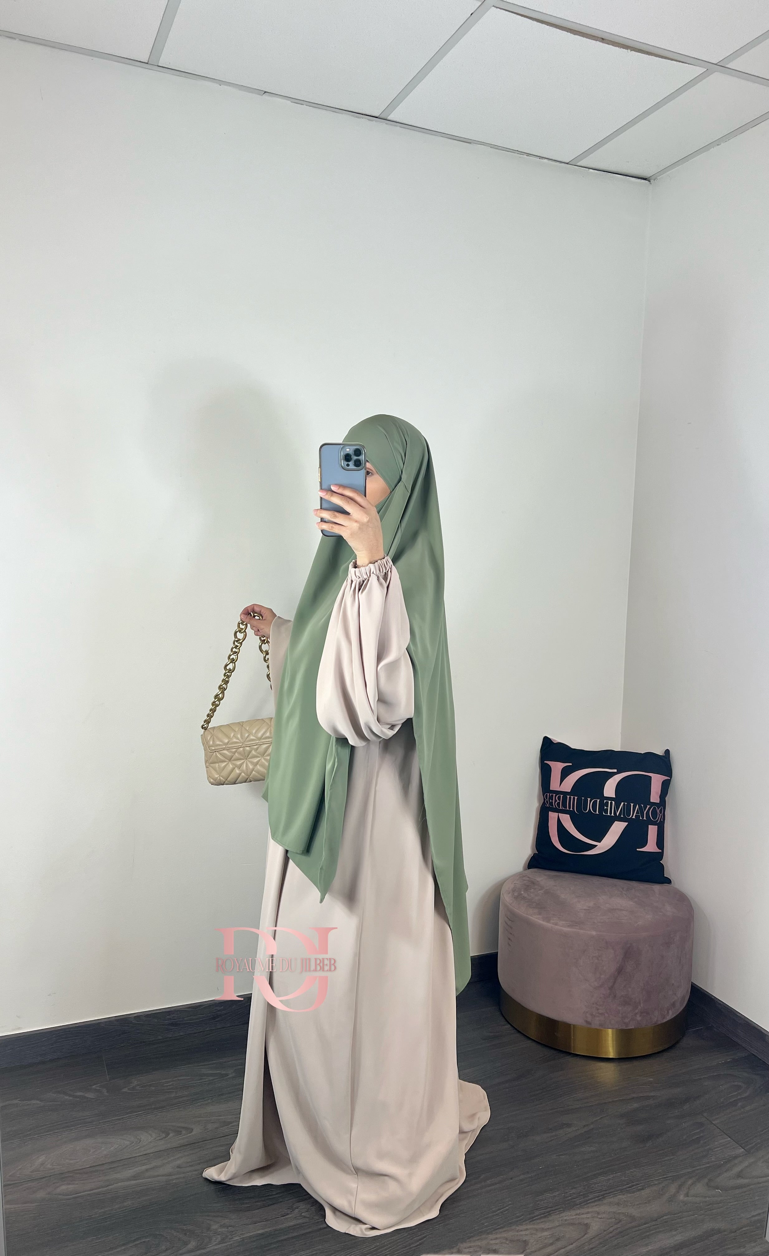 La abaya portée est la abaya Esmaa, couleur beige coton