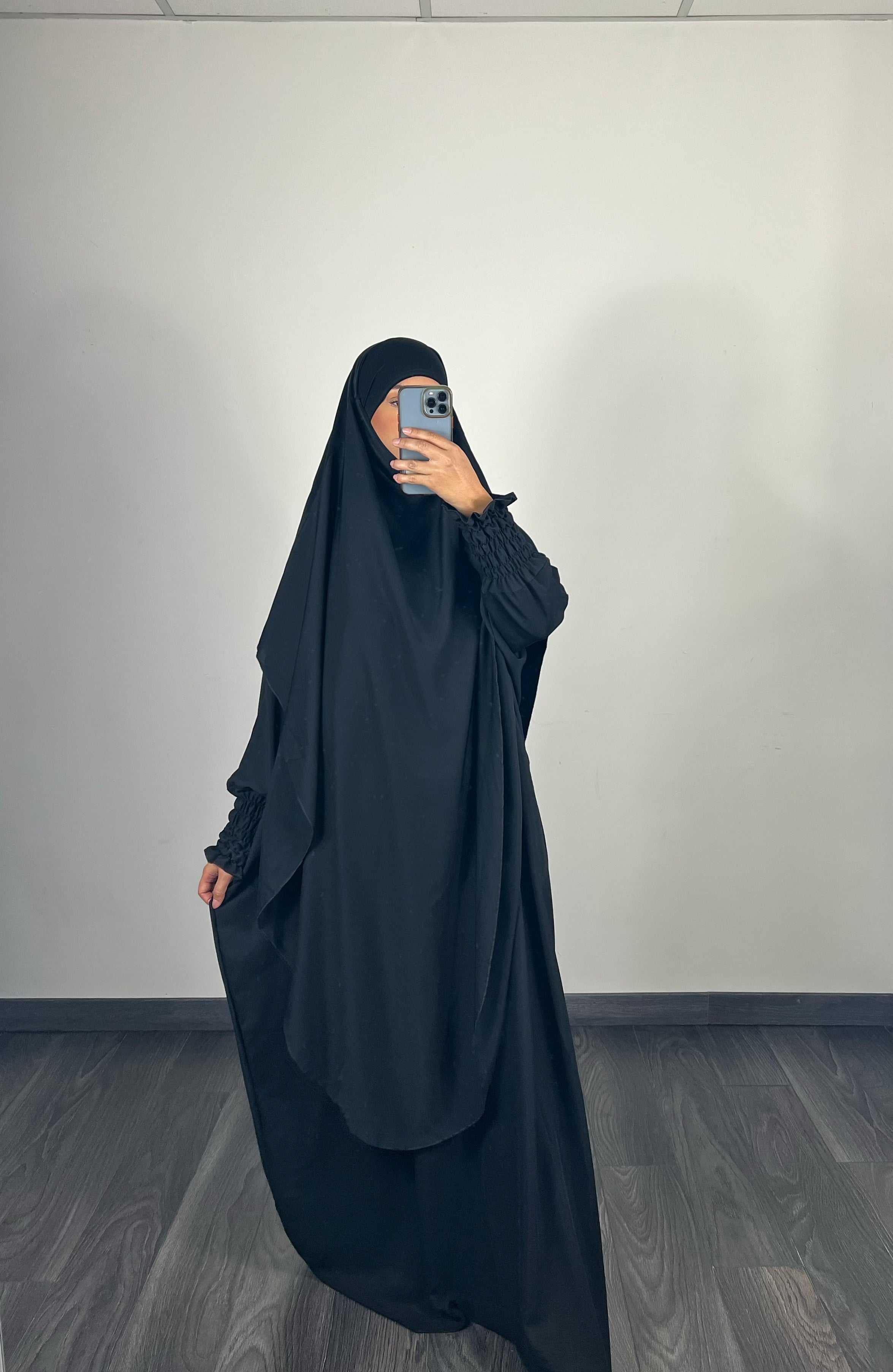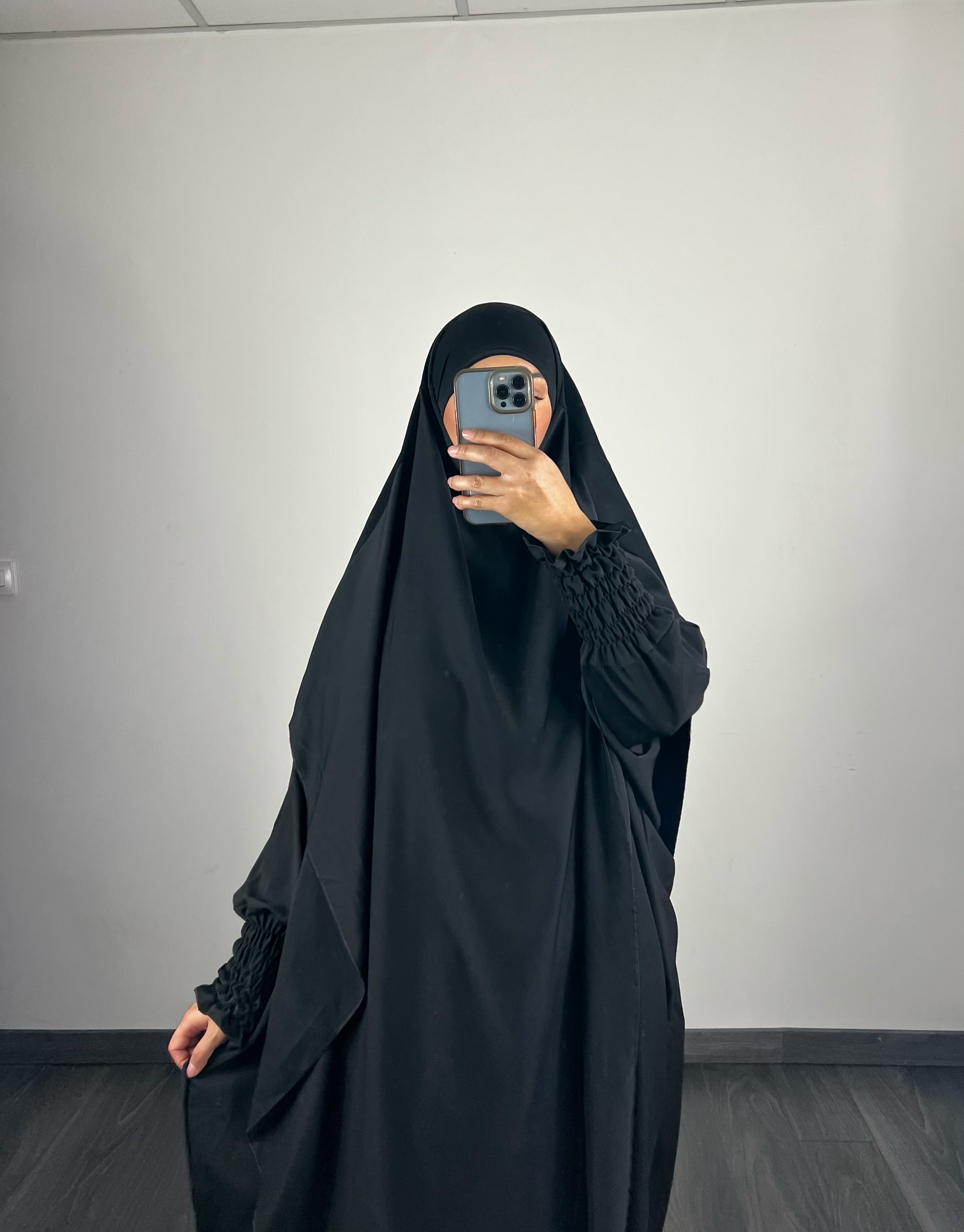 Abaya de longueur 145cm avec manches élastiques et khimar arrondie mesurant 120cm à l’avant et 135cm à l’arriere.