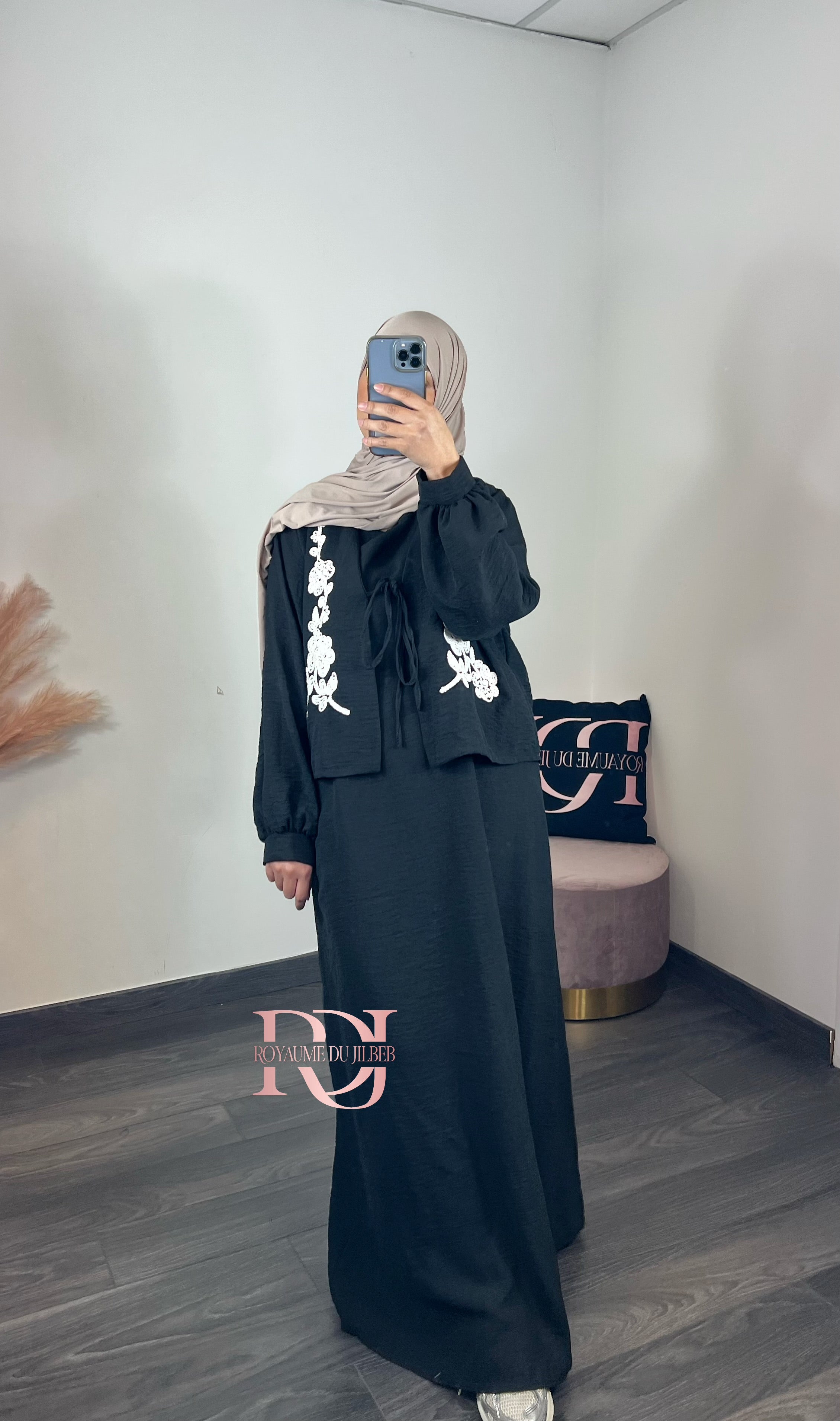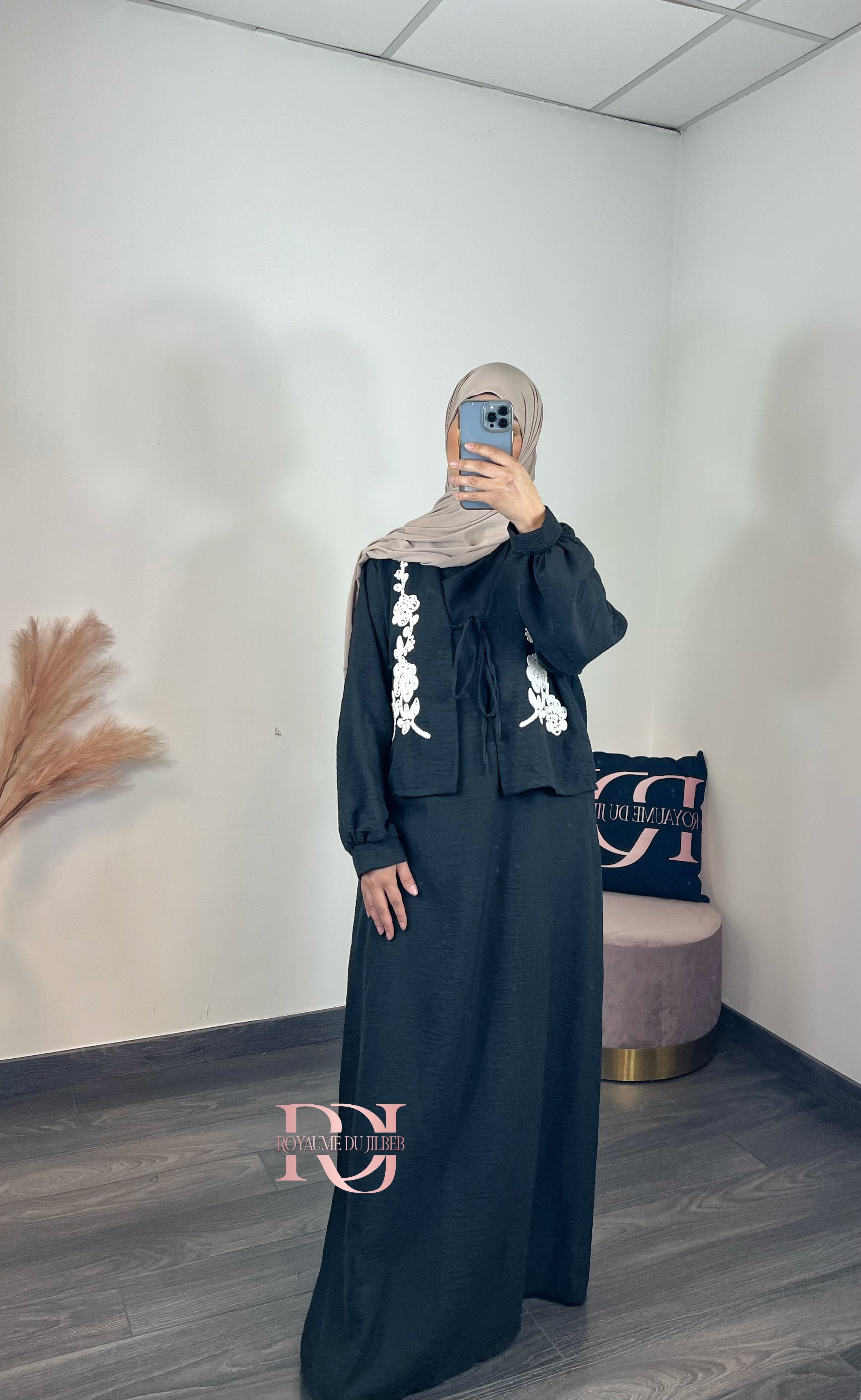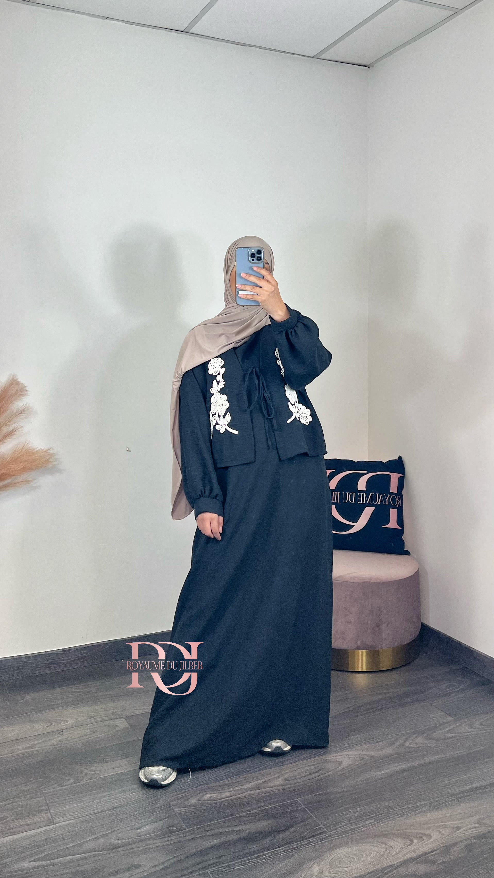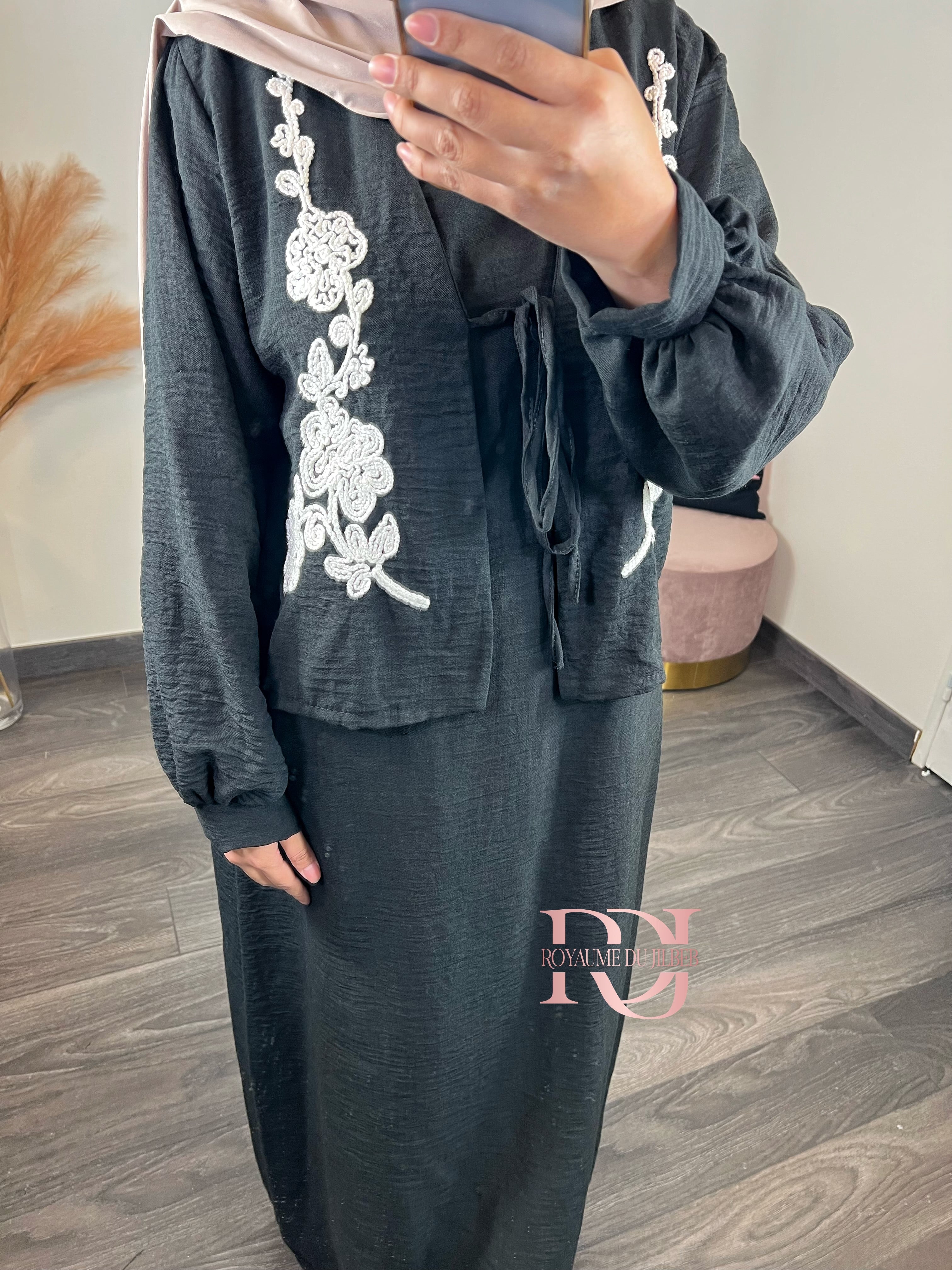 Ensemble composé d’une sous-abaya sans manches et d’un petit gilet à nouer avec détails borderie, en tissu trés leger type lin, trés agreable l’été.