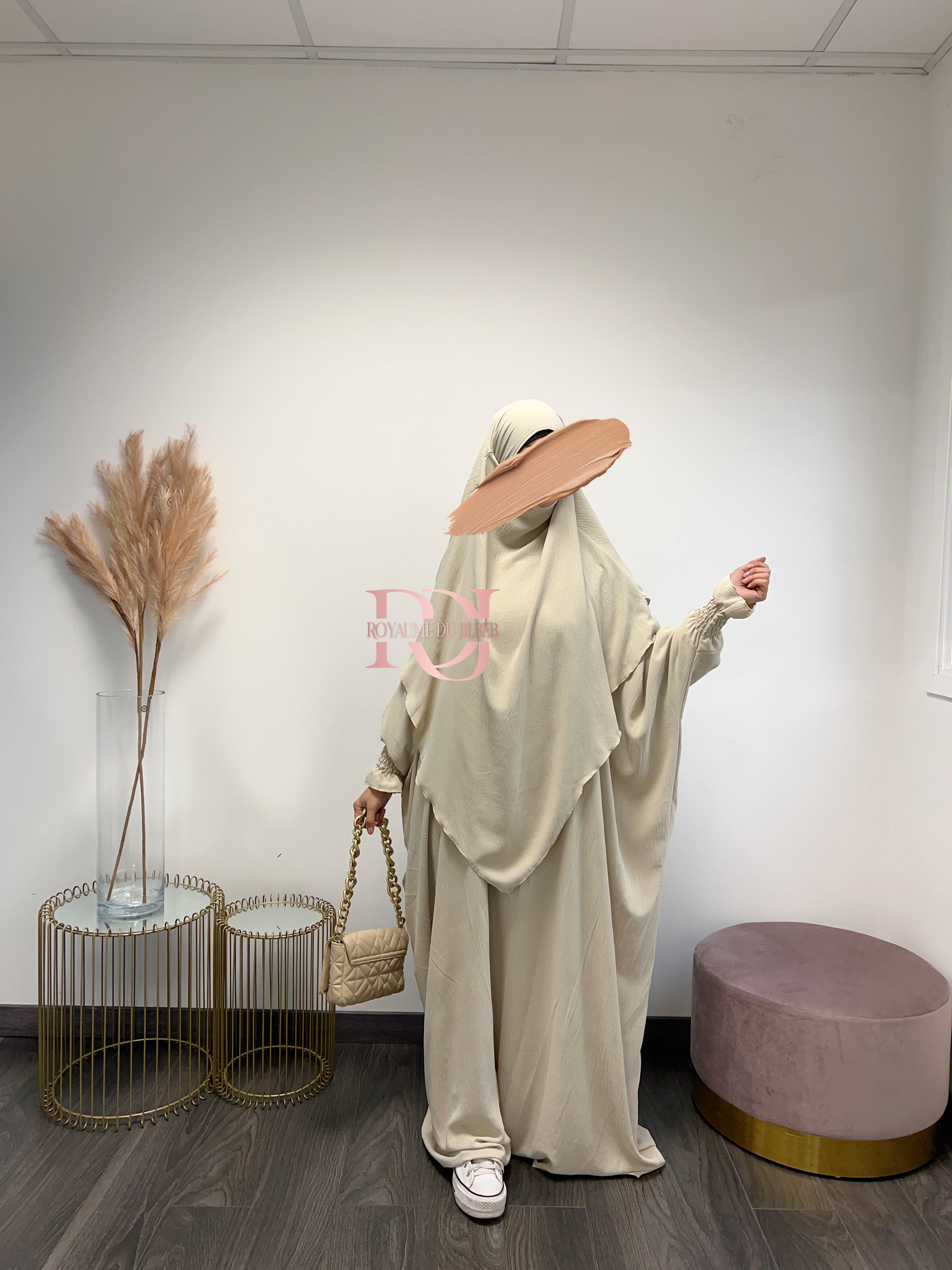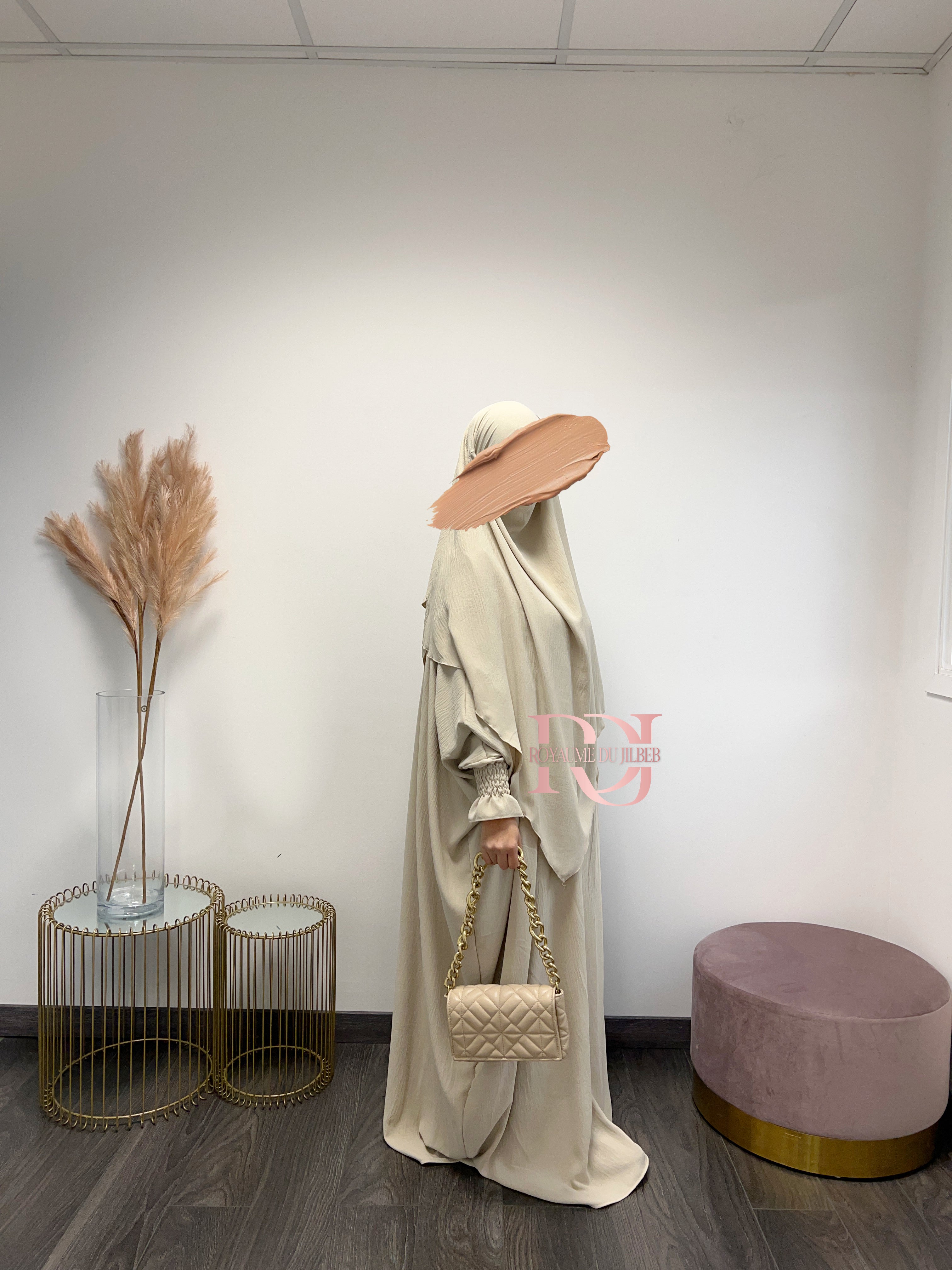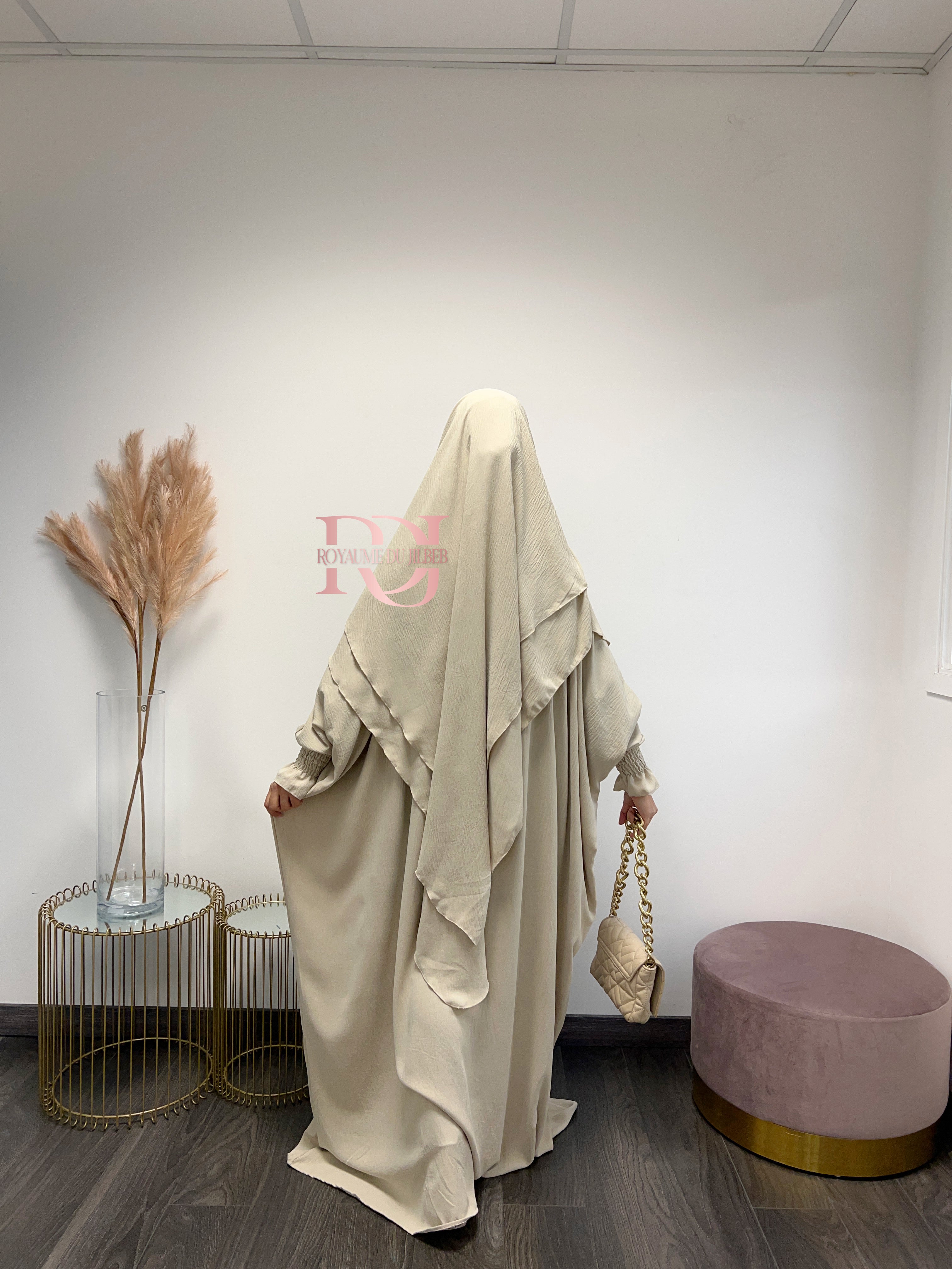 Ensemble jazz abaya + khimar 2 voiles, couleur beige creme