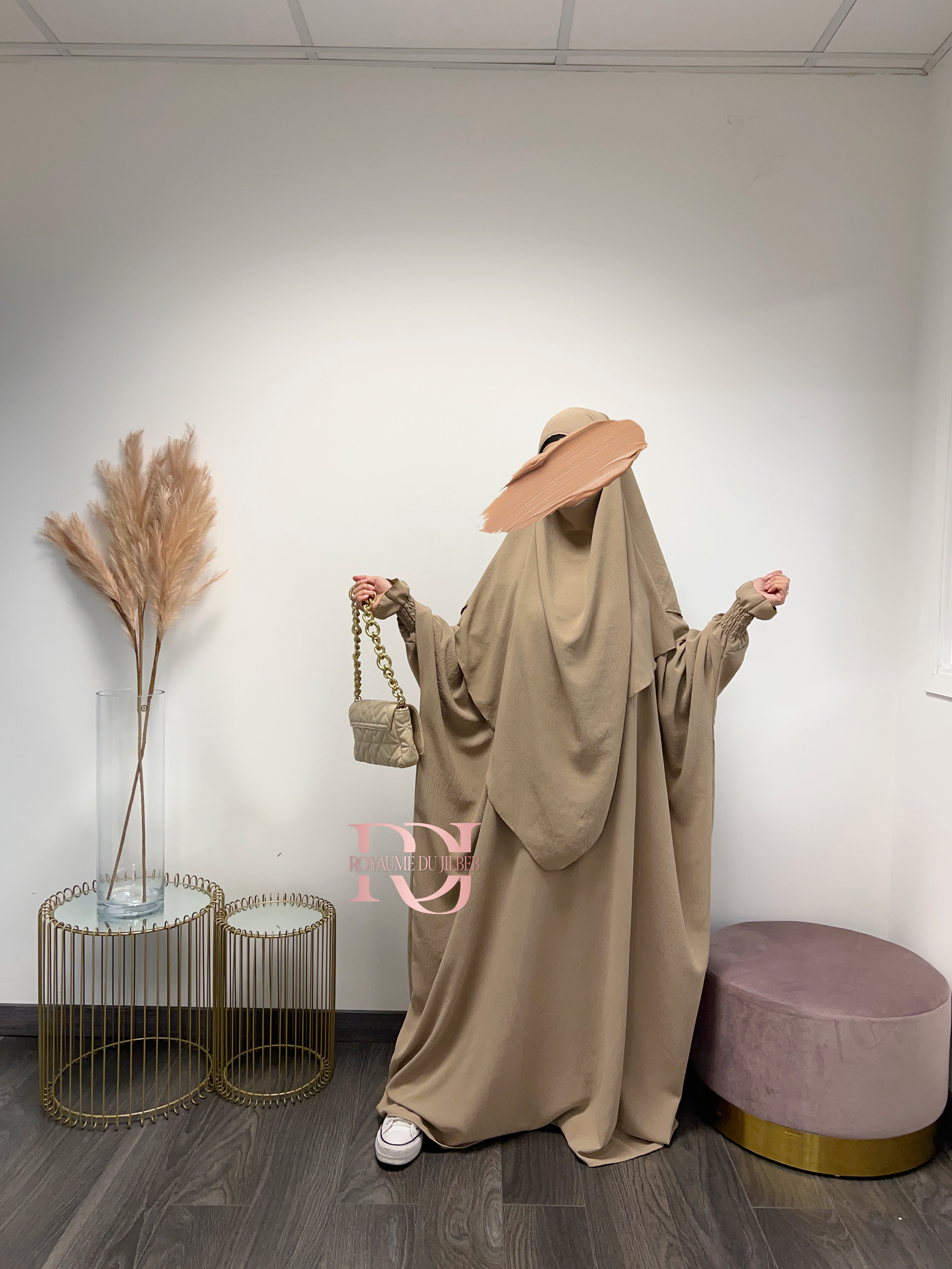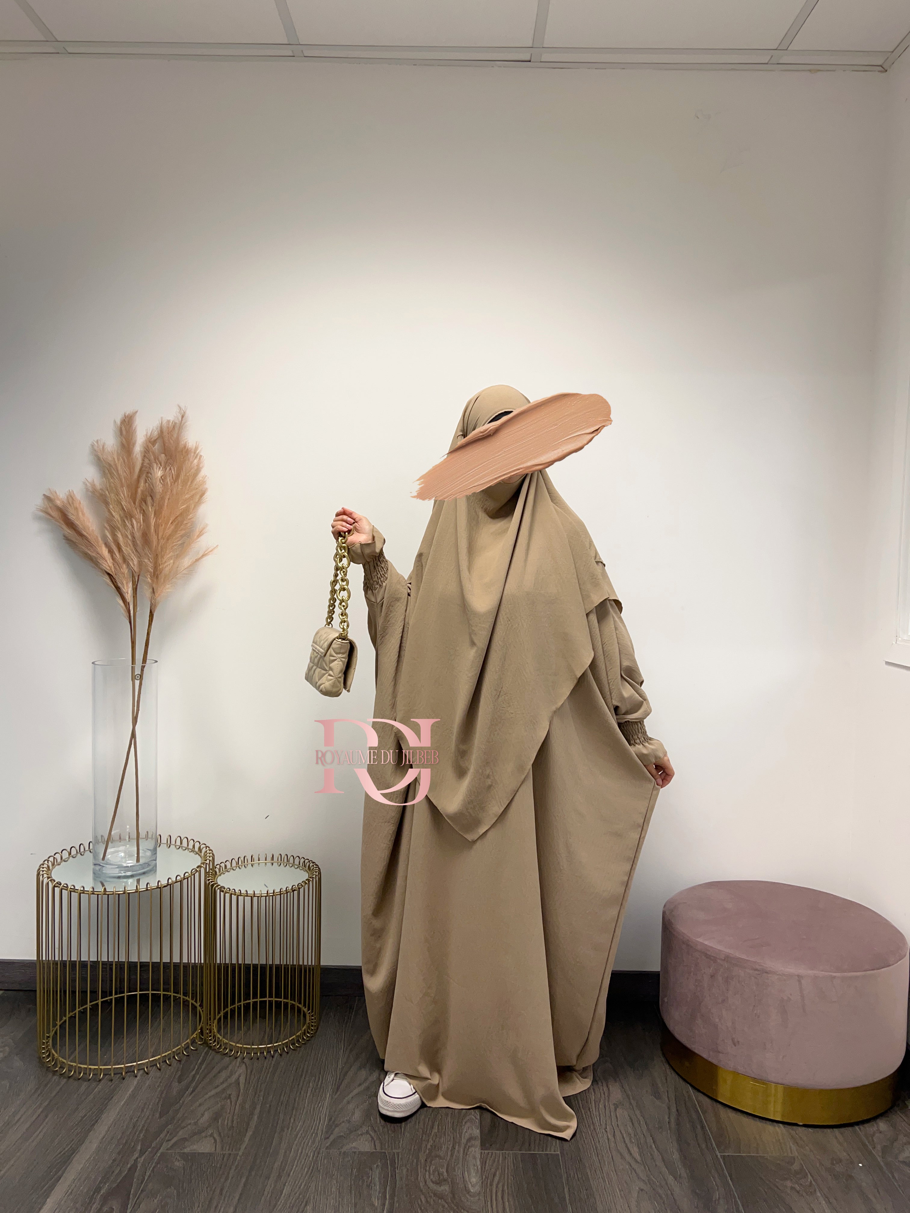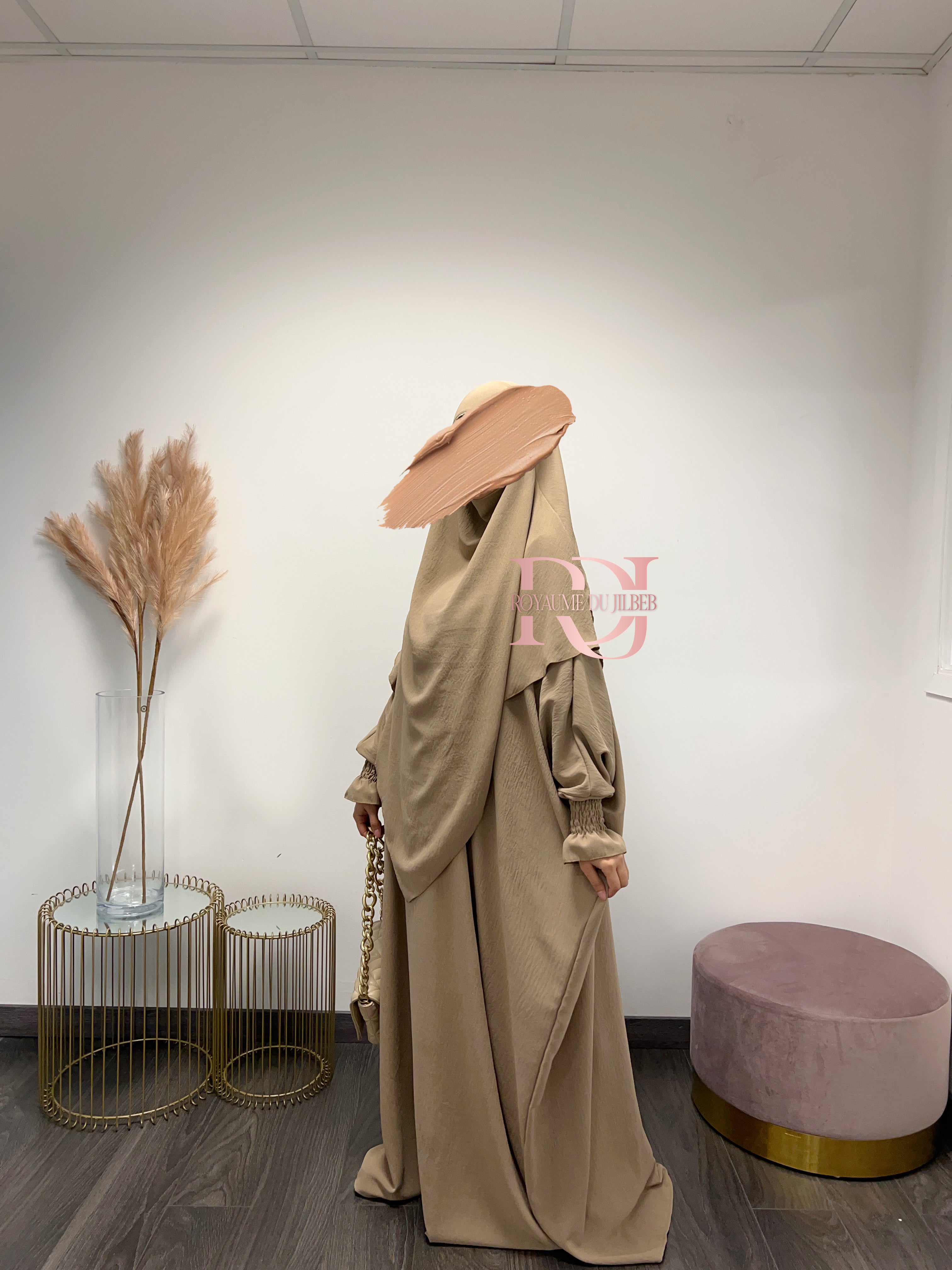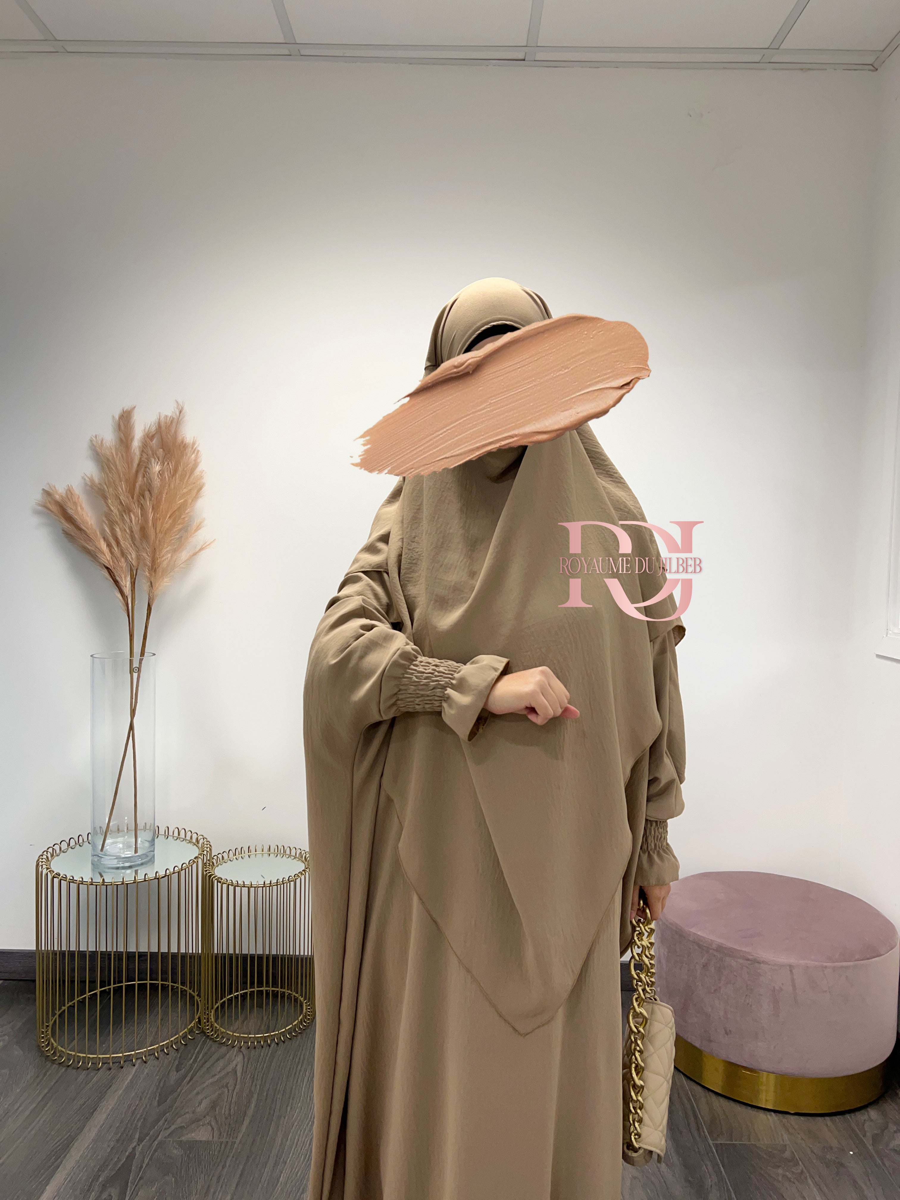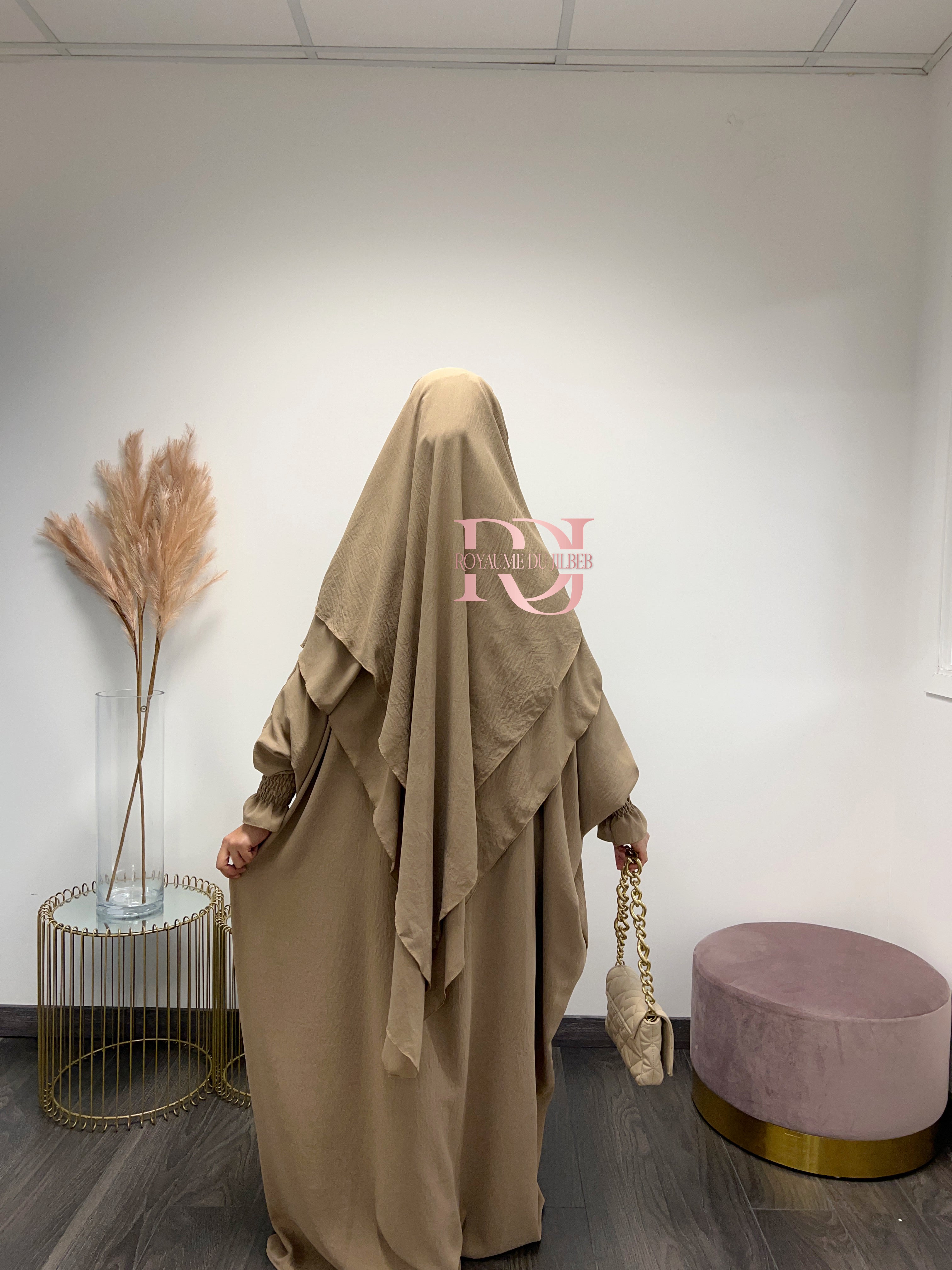 Ensemble jazz abaya + khimar 2 voiles, couleur beige foncé